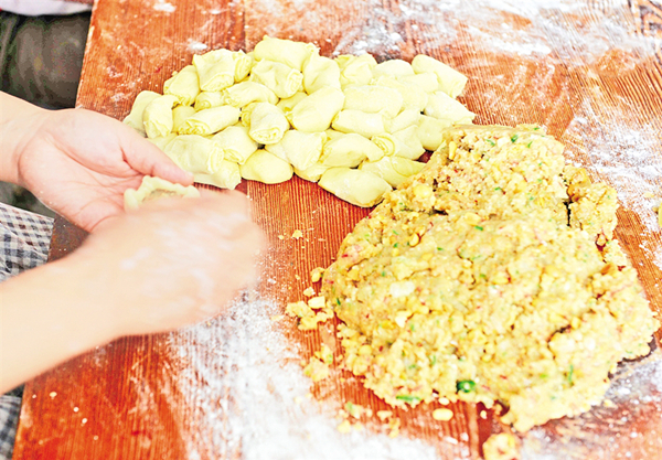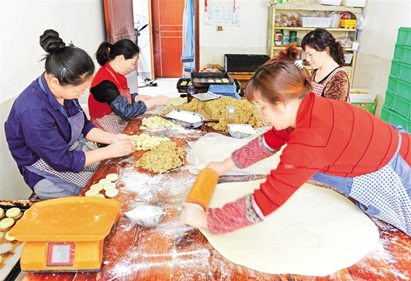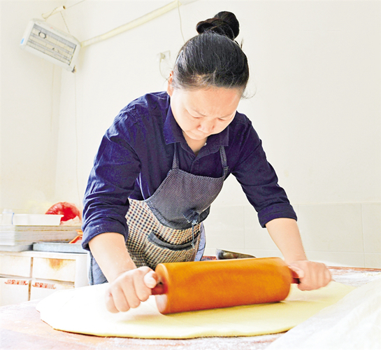 制皮、制馅、制酥、包酥、成型、盖章、扎眼……四个人在操作时不言不语,只顾埋头做活!