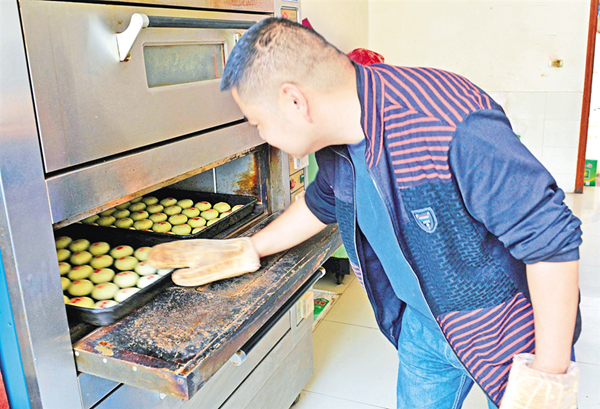 马霄则负责着烘烤这个关键环节,在一天中的不同时段,电压的变化让他必须严格把握烘烤时间,经验让他准确把握着每一炉需要的时间,时间长则烤硬烤焦,时间短则夹生不酥!