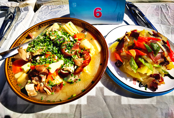 吊罐炖猪蹄、洋芋粑粑炒腊肉、小白菜煎豆腐、油洋芋焖米饭……蔬菜现摘,土灶现炒,厨师把锅颠得火星四射,一会儿工夫,一大桌质朴家常却极具当地特色的佳肴,就……