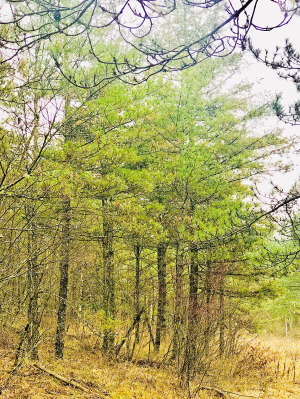 凋叶残雪薄冰,绿苔红桦深林;