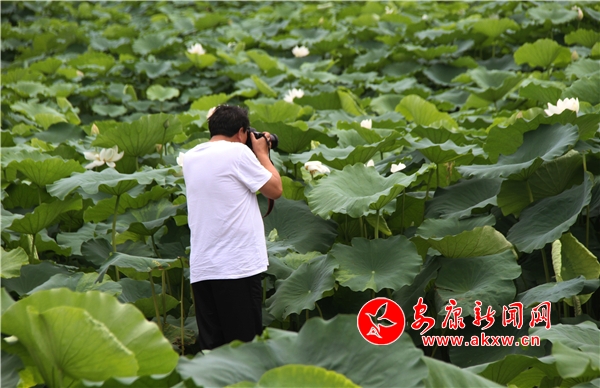 在荷塘间,游客们徜徉其中,赏花拍摄,成为双乳镇盛夏的一道亮丽风景。密密层层的碧绿荷叶滚动着晶莹的水珠,一枝枝粉红色、雪白色的荷花亭亭玉立,散发着淡淡的幽香。站在对面的山上极目远眺,大片的荷花在阳光的照耀下显得分外妖娆。