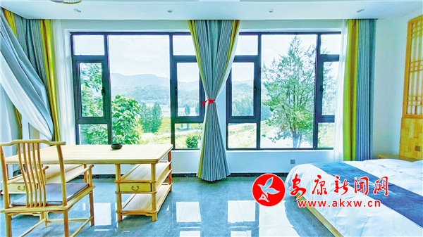 半山腰的独栋别墅白墙黑瓦,飞檐峭壁,处处渗透着平淡质朴的古典韵味。徽派建筑背倚青山,面朝峡谷,坝河水在谷间缓缓流淌。别墅里每一间都布置得精致高端,站在二楼落地窗前,观连绵青山,赏花鸟飞禽,让人陡然间心静如水。