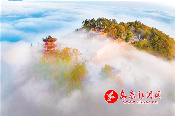 天柱山最美不过秋色,也是我在四季当中频繁上山的季节。每逢秋天,这里红黄绿相间,漫山挂彩,在蓝天的映衬下,多了几分浪漫。从国道211起点的两条上山公路,由数个“之”字连接起来,从湖边一直盘旋至山顶的白云古寺,远眺仿佛一个大大的“人”字形飘带。雨后放晴的头两个早晨,在云雾的笼罩下,天柱山的下半身连同湖面一并被巨大的“蚕丝被”覆盖,山的上半身或山头浮在云海之上,像是茫茫大海上的一座孤岛。
