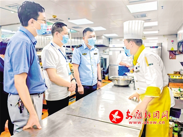 “五一”假日将至,汉滨区纪委监委会同市场监督管理部门对中心城区酒店餐饮服务场所开展监督检查。图为检查组在某酒店后厨了解情况。郑时根 摄
