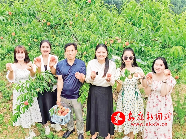 “水蜜桃熟啦,欢迎大家来采摘!”陈显攀一边说,一边搓着手。果园里是一群正在采摘桃子的游客,最惹眼是身着彩衣的年轻姑娘们,她们挎着竹篮,穿梭在桃树林间,艳阳映红了蜜桃,也映红了她们的脸庞。