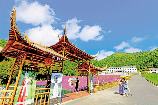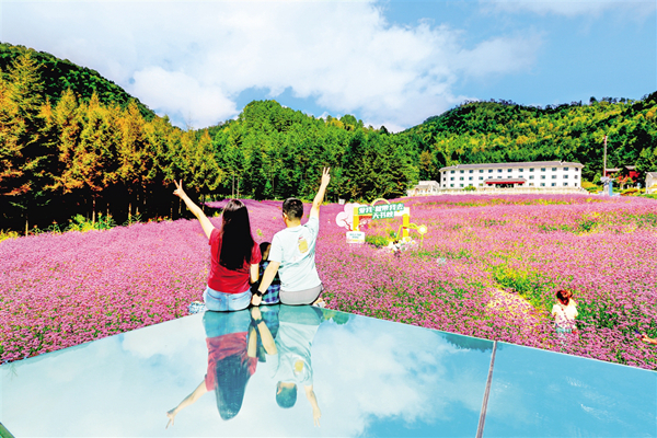 中秋节期间,平利千家坪森林公园天书峡马鞭草花竞相怒放。如画的景色吸引众多游客前来赏景打卡。(詹永桂 摄)7NW安康新闻网