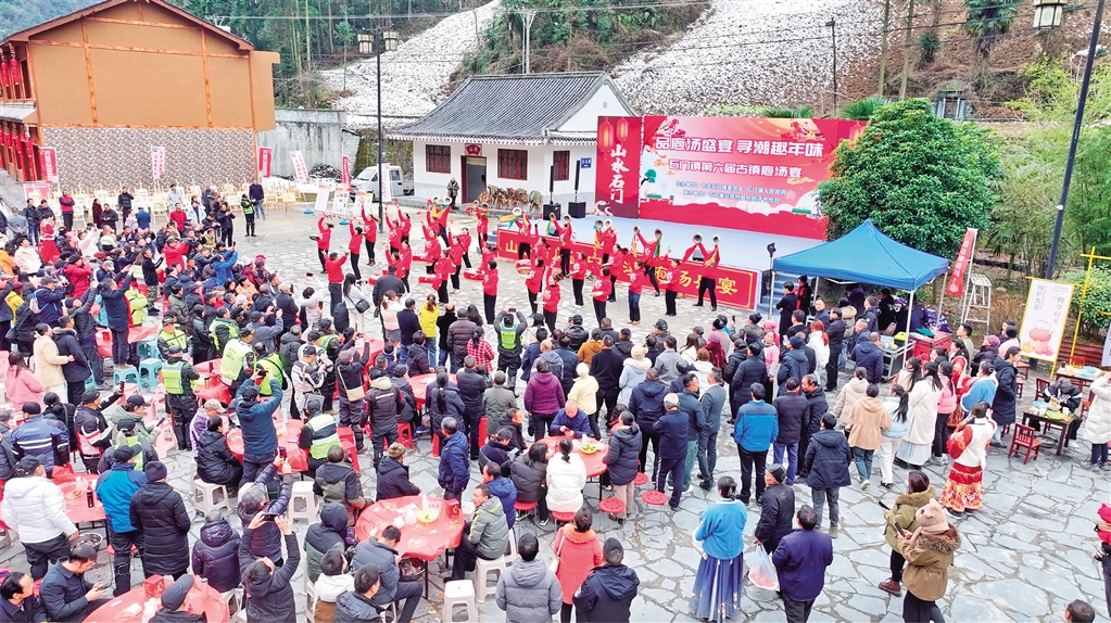 据了解,为了准备此次庖汤宴,去年12月底,石门镇总投资120余万元开始进行横溪古镇旧房改造提升项目,着力打造“古镇庖汤宴”品牌。经过项目改造,古镇完成全面升级。不仅如此,石门镇政府还不断通过“线上+线下”的宣传方式,提升当地旅游业影响力,积极制作旅游宣传视频,此次活动带动引流2000人次。(柯明宇 摄)