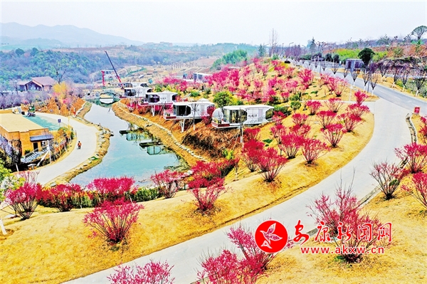 安康高新区桃花源,梅花与露营地星空房、湖溪亭榭相映成画。詹永桂 摄