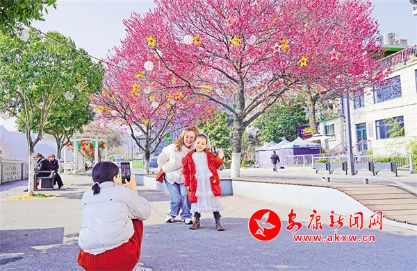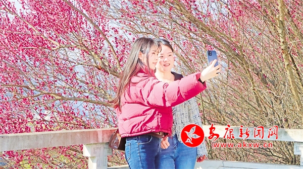 石泉县滨江大道上红梅竞相绽放,广大游客驻足观看,打卡留念。谭文昌 摄