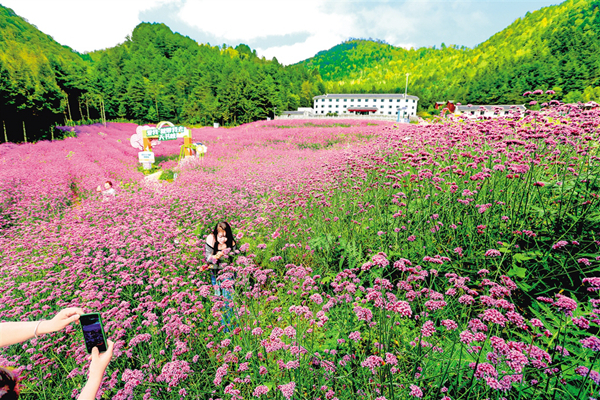 合影留念中秋节期间,平利千家坪森林公园天书峡马鞭草花竞相怒放。如画的景色吸引众多游客前来赏景打卡。(詹永桂 摄)……