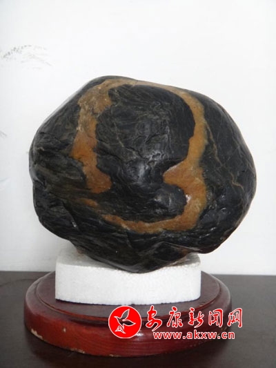 此石为汉江水墨石,亦称金带石,石长22㎝、宽20㎝、高16㎝.石形完整,色彩对比明显,头像轮廓比例协调,人物五官清晰可见,面部表情呈沉思状,尤以“鲁迅”先生标志性小寸发和八字胡最为传神,令人叹为观止!