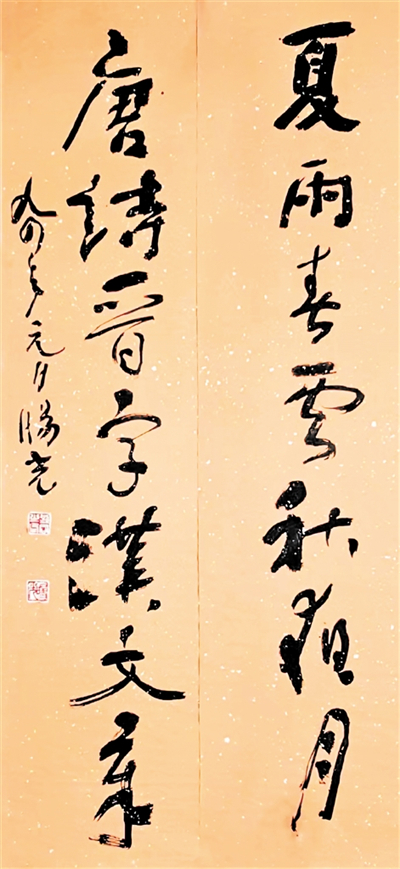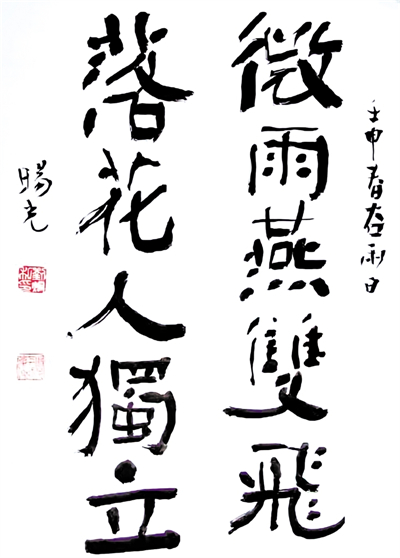 纵观刘旸光先生的作品,其正楷笔致遒劲、骨肉停匀深谙晋唐书理;所做隶书,结体开张、笔意潇洒、饶有“石门”的遗意;其草书气机畅达、空灵疏朗、暗合明人意趣,而篆书则变化多端、垂脚舒展、顾盼自然,大有周秦风韵。在腾挪跌宕的线条构筑的黑白空间,捕捉转瞬即逝的灵感。他的作品意在笔先,胸有成竹,中侧锋并用信手挥洒,一气呵成,笔墨酣畅、淋漓尽致,如入无人之境,观赏先生作书简直是超然于物外的享受。