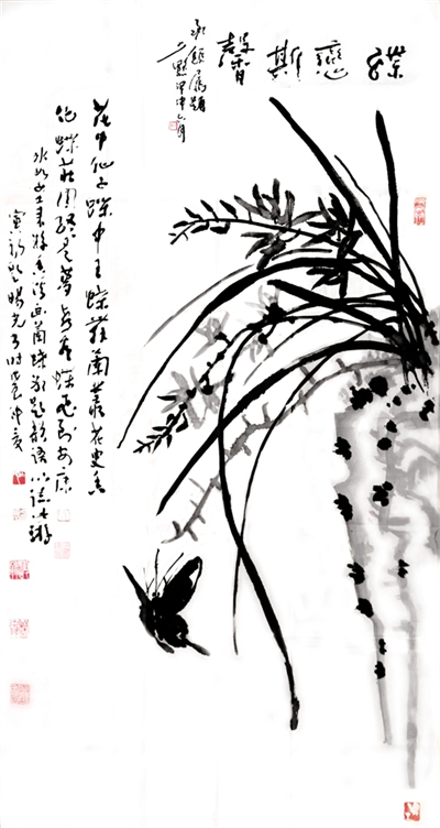 1988年,中国画坛号称“蝶王”的王冰如女士,以80岁高龄回到她曾工作生活10年之久的第二故乡安康举办画展,并且以诗书画会友,特邀旸光先生和金州著名诗人刘寅初老人同游香溪,冰如老师兴之所至,巧绘墨蝶,说道“人言寅初老弟有曹子健七步成诗之才,今日以十步为限,将此画为题,赋诗一首,旸光老弟书于其上如何?”寅初老只走了三步便道有了,于是顺口吟诵,旸光先生挥毫急就“花中仙子蝶中王,蝶舞籣丛花更香,化蝶庄周终是梦,喜看蝶王飞安康。”一笔流畅的行草跃然于画上,相辅相成,真是诗情画意天作之合。一幅难遇难得难觅的“三绝图”诞生了。冰如老师感慨万千,说到“二位弟台才高八斗,只可惜待在安康这个贫瘠的地方被埋没了也!”这个场面是一种巧合,正是旸光先生“万事随缘”的结晶,尔后经书坛大家陈少默先生为之题跋做款,更是锦上添花,成了四绝图。冰如、少默、旸光、寅初先生已然作古,这段翰墨丹青之情,将永存世间传为艺术佳话。