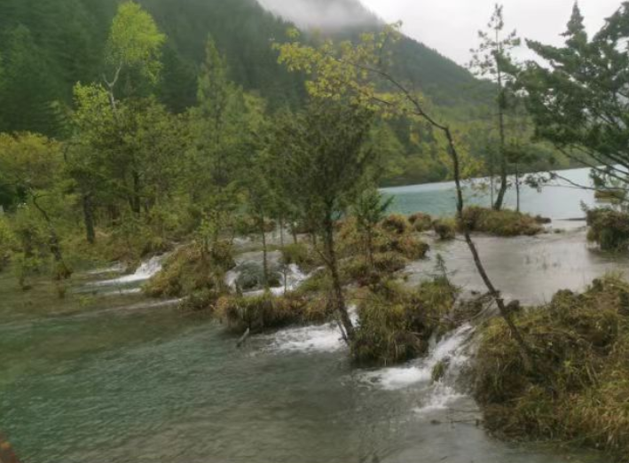 杯口群峰环绕松柏耸翠,原始森林拥抱一池碧水,身后便是岩崖冷峻的雪山。雪水从雪山流下汇于长海,硕大的堰塞湖,四季丰盈,万年不枯。调节的方式就是顺石岩裂缝向下渗透,沿杯壁而下,就衍生了一串造型各异,变化多样的瀑布和湖泊,如藏族姑娘项链上的珍珠。九寨沟的水本无奇异,只因地理之变,环境相殊,山光幻化,将一串串珍珠点染得五彩斑斓,美不胜收。