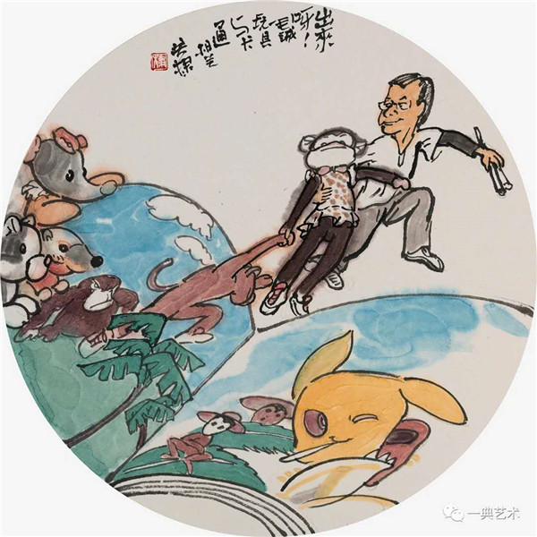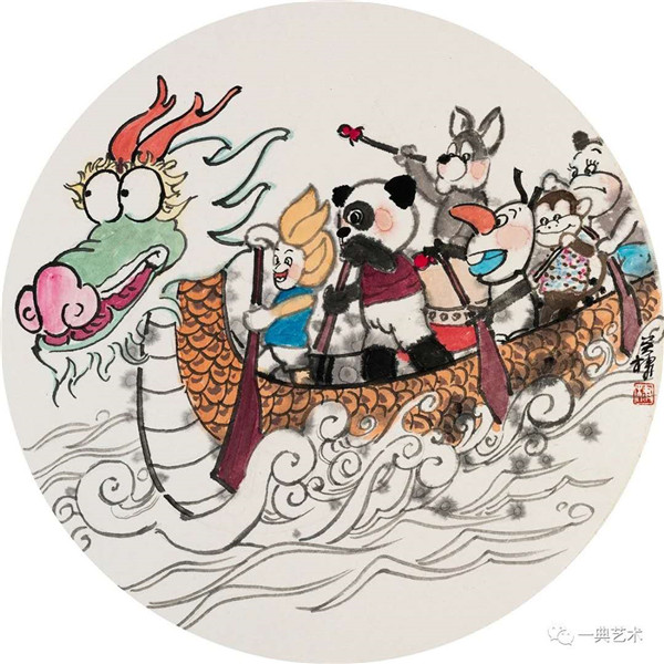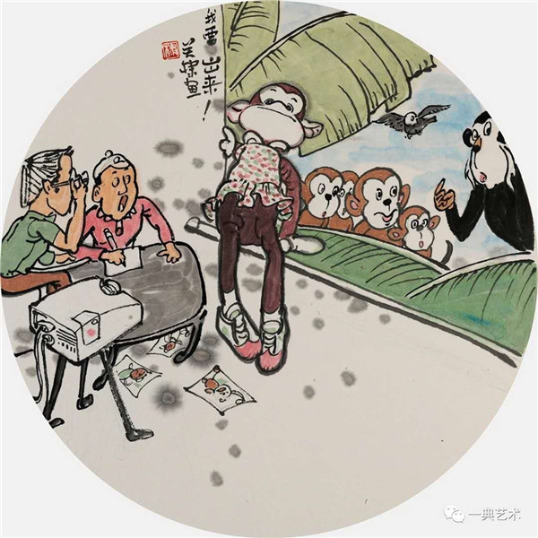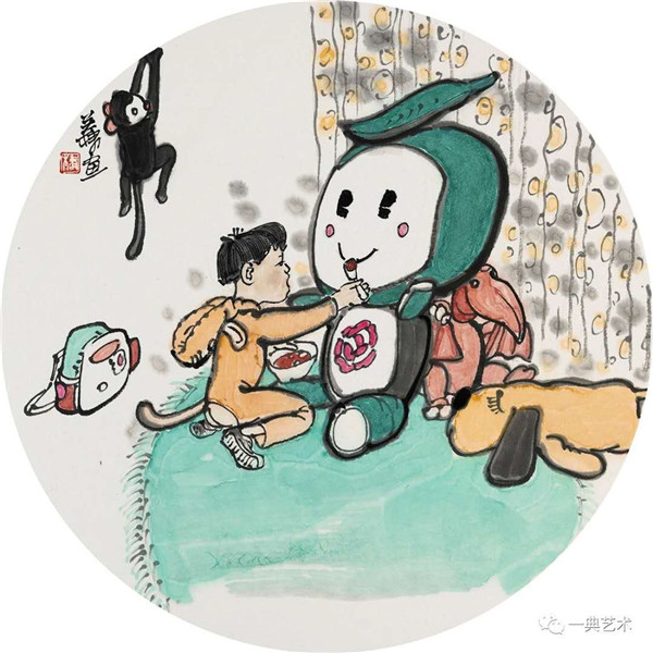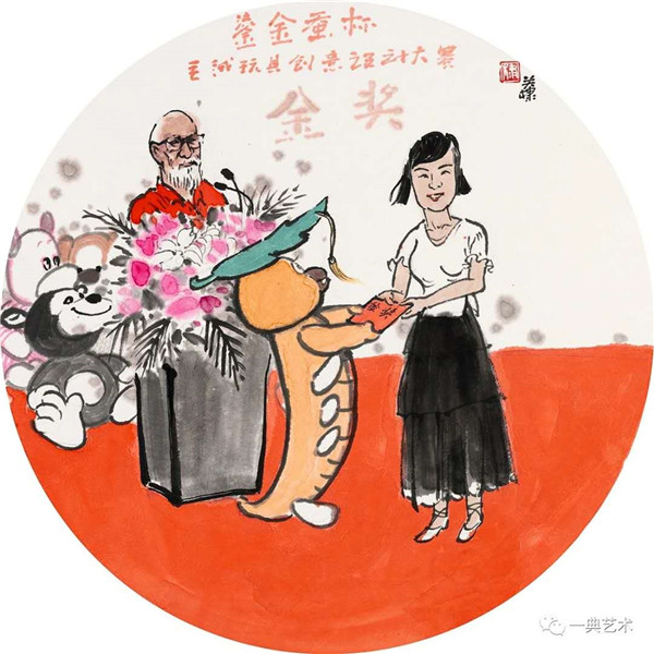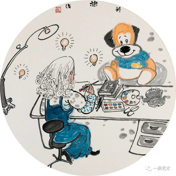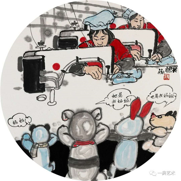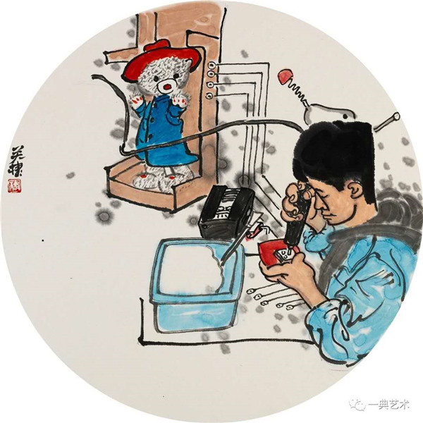 创作这个题材,我思考的内容是丰富的,表达方式是明晰的,创作冲动是丰沛的。在初期,当没有门径的时候,曾经请人社局根据文字资料“划重点”,而人社局领导给了很宽泛的态度:没有重点,只要和毛绒玩具相关。这一态度实际上解放了我的思想,放开了我的手脚:寻求有约束的自由——给以充分自由——自我追寻“有约束”的自由。好吧,自己给自己寻找方向!考察结束,创作方向已经确定:以人和毛绒玩具作为主要表现内容,以中国水(彩)墨画为形式。在那几天(直至今日)我头脑里充斥着毛绒玩具和女工的形象,两者形异神同,就像《西游记》中人神共处。因此,创作中我将人和物都以“人”的精神面貌进行刻画,为了艺术语言的统一,将人略作夸张,并力求“以形写神”“形神兼备”,并设定一定情节性、趣味性。实际上毛绒玩具在设计过程中,应该是运用了文学领域的比喻、比拟、夸张、类比、通感等修辞手法,这也是我在创作中经常用到的手法。我是一个中国画家,因此作品强调中国画的意蕴,任何时候,不忽略笔墨的表现。为了符合这个产品的特性(装饰性、时尚性),我有意识吸取了一些水彩画的表现语言。无论从思想上、技法上,不脱节传统、不疏离当代。这种表现,(也许)增加了作品的艺术性。