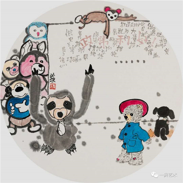 对于政策性的以及企业生产经营活动,在这批作品中也有一定的表现。表现这种内容是有难度的。创作中,我设定了毛绒玩具与政策的“互动”:譬如,我在一幅画中,一群玩具的背影在观看“安康六条”,而“安康六条”的缝隙,画了许多活泼淘气的玩具,透露出毛绒玩具产业的兴旺发达。另一幅是一些毛绒玩具在好奇地观看“看板”上的各种支持政策,一个调皮的猴子趴在看板顶头给大家讲解政策,拟人化、趣味性、含蓄、有情境,应该解决了这类“难题”。