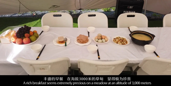 丰盛的早餐,在海拔3000米的草甸,显得极为珍贵。彩色鸡蛋、蜂蜜面包、生态烤肠、草甸稀饭多种选择,可以满足不同的口味,激发着多情的味蕾。
