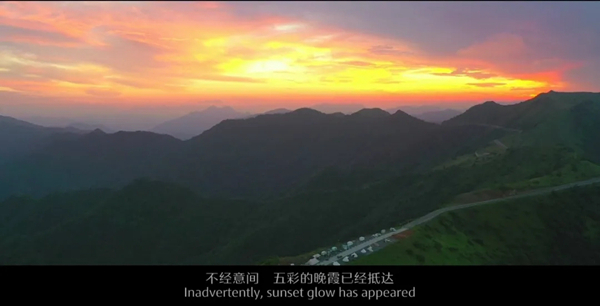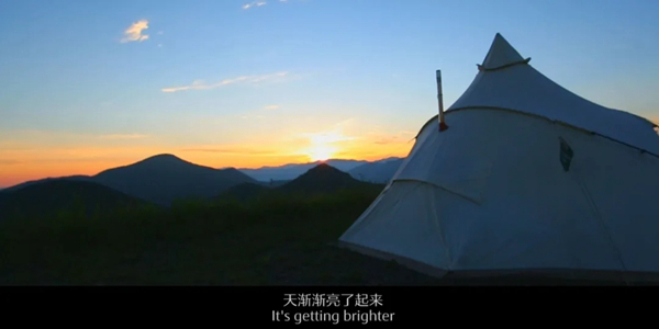 天渐渐亮了起来,越过重重山脉的阳光 映红了云层,照亮了山谷,催醒了沉睡的动物,一顶顶帐篷像隆起的蘑菇 生⻓在云端之上。